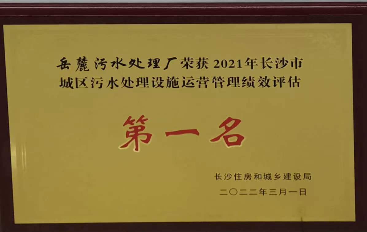 長沙市岳麓污水處理廠榮獲 2021年度污水處理設施運營管理績效評估第一名